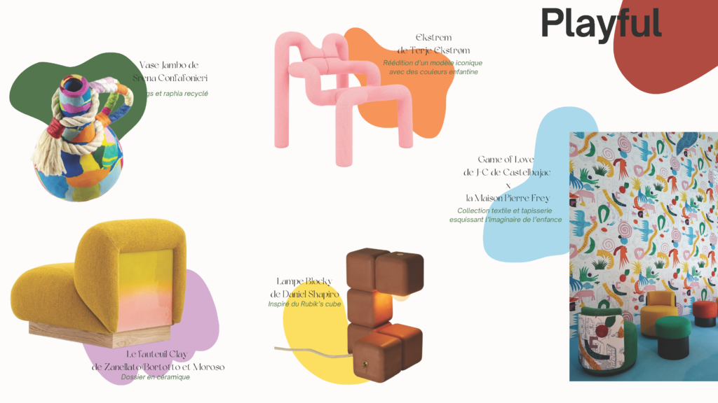 Elle s’inscrit dans un univers ludique plein de fantaisie, où l’objet devient un terrain de jeu espiègle. Elle détourne les codes du design classique avec humour et trompe-l’œil, en introduisant des matières étonnantes comme le tufté, la céramique, le miroir acrylique recyclé, le bois laqué, la résine upcyclée ou encore le polyéthylène recyclé en table. On retrouve des créations joyeuses et colorées, telles que des fauteuils « clay » aux dossiers en céramique, des vases réalisés à partir de tongs recyclées, des installations murales poilues ou des tentures tuftées pensées comme des œuvres décoratives plutôt que de simples tapis. La palette chromatique est très pop, arc-en-ciel et inspirée de l’univers de l’enfance, parfois volontairement primaire, avec des formes géométriques ludiques, des graffitis enfantins ou des gribouillis transformés en art de la table, comme dans la collection Game of Love de Pierre Frey. Entre mobilier modulables, illusions optiques façon miroir Magis, chaises tubulaires type Loopu ou encore clins d’œil au Rubik’s cube et à l’origami, cette esthétique célèbre un retour assumé à l’enfance et à la régression joyeuse, où fun, expérimentation et poésie s’entremêlent.