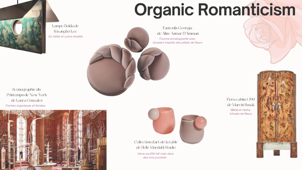 Elle explore une esthétique néoromantique où le vivant devient poésie, et où le désuet ou le ringard est remis au goût du jour avec délicatesse. Privilégiant des formes libres et sensibles qui mettent en avant les irrégularités, comme une célébration de la nature imparfaite et d’une nature sensuelle. La colorimètrie reprend des teintes poudrées, douces inspirées de pétales fanés, d’argiles claires ou des herbiers séchés affirmant une ambiance apaisante. Les matières sont riches et variées : cuivre émaillé, fibre de verre, laiton moulé façon crochet, résine infusée de fleurs, dentelle, mais aussi des supports inattendus comme l’aluminium travaillé avec des coquillages ou l’impression de photographies sur parchemin. Les couleurs se déclinent dans des teintes douces, poudrées, inspirées des céramiques anciennes ou des étoffes drapées. Les exemples se multiplient : meubles aux nuances printanières, vases Dior en verre fleuri en ode à la nature, décors floraux new-yorkais, ou encore fauteuils drapés façon after club. Cet univers d’Organic Romanticism traduit une volonté de renouer avec une esthétique sensible, entre héritage romantique et une nature contemporaine, l’imperfection devient une force expressive.