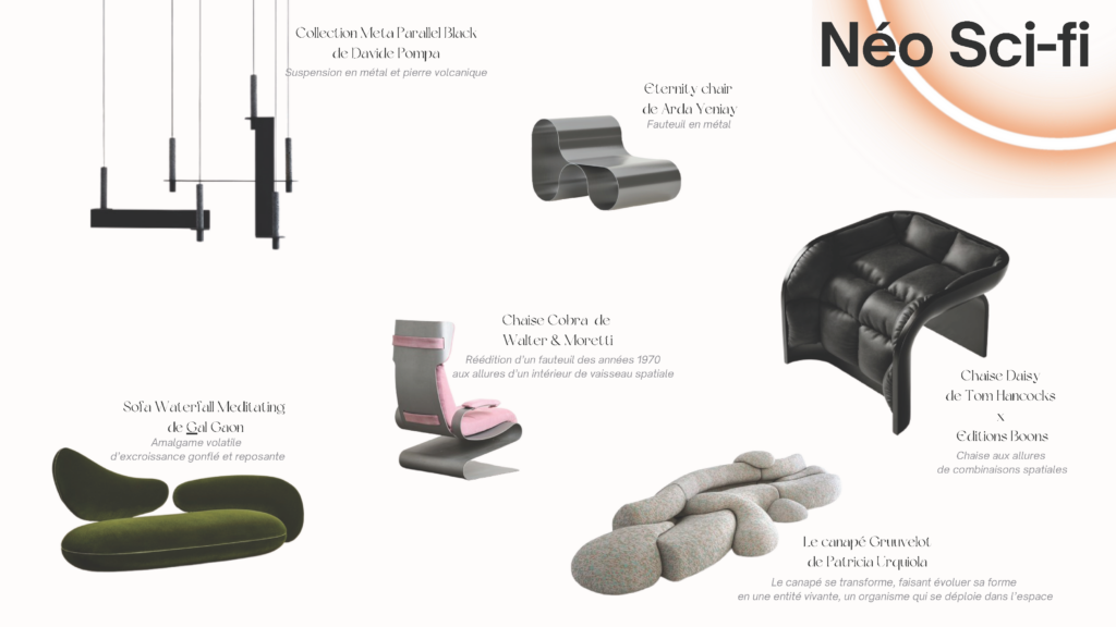 Cette tendance explore un imaginaire futuriste où chaque objet semble provenir d’ ailleurs. Elle célèbre l’étrange, comme un crash onirique entre l’espace et la matière terrestre. Les designers puisent dans des matériaux qui évoquent l’inconnu : roche volcanique utilisée par David Pompa, verre bullé aux reflets glacés, métaux sculptés en sièges et lampes à la fois élégants et intemporels. L’univers se prolonge avec des créations comme les luminaires et sofas de Gal Gaon (The Heaven), les canapés de Diesel aux accents space age, ou encore les pièces de Boon Editions, tout droit sorties d’un paysage post-apocalyptique. Les couleurs naviguent entre gris métalliques, noirs profonds, blancs lunaires et touches excentriques d’orange, souvent en bicolore pour accentuer le contraste. Les formes, elles, oscillent entre acérées et organiques, modulaires, gonflées, étranges, presque osseuses ou volcaniques, comme des fragments primaires d’une autre planète. Lampes sphériques, chaises « edge of digital » ou modules inspirés de roches primaires composent cet univers singulier où le design devient un voyage interstellaire, entre fascination et étrangeté.