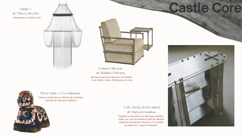 Réinvente l’imaginaire médiéval en lui donnant une touche contemporaine et théâtrale. Elle invoque l’aura de la noblesse et des forteresses, dans une version revisitée, où la rigueur du passé se mêle à une créativité moderne. Les matières emblématiques comme le métal, le fer forgé, la cotte de maille ou les chaînes sont détournées pour devenir des éléments de design singuliers : lampes en chaînes signées Thierry Dreyfus, étagères en cotte de maille, fauteuils réalisés à partir de déchets de radiateurs, ou encore chandeliers en verre travaillés comme une armure. Les effets de marqueterie en peau de shearling teintée prolongent cette idée d’artisanat noble revisité. Les formes rappellent l’architecture ancienne, entre créneaux de châteaux et structures de cirque, tout en flirtant avec des univers numériques et immersifs (assises “reality of the virtual”). Dans le Castle Core, le design devient un décor de conte revisité, où le patrimoine médiéval dialogue avec la fantaisie et l’innovation.